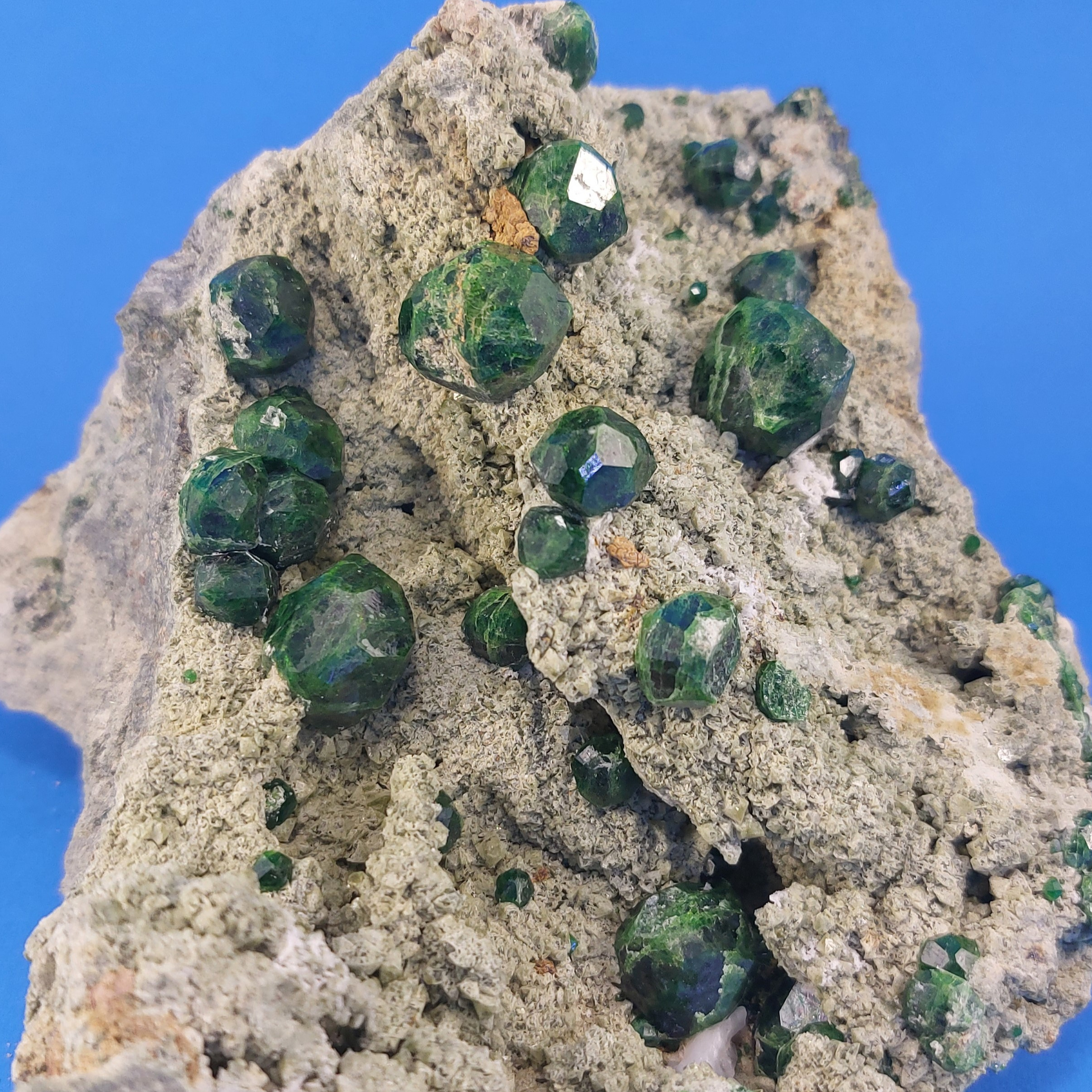 This striking specimen of *natural Demantoid Garnet* features vivid green crystals embedded in a light-toned matrix. As one of the rarest and most valuable types of garnet, demantoid is highly prized for its vibrant green hues and exceptional brilliance.